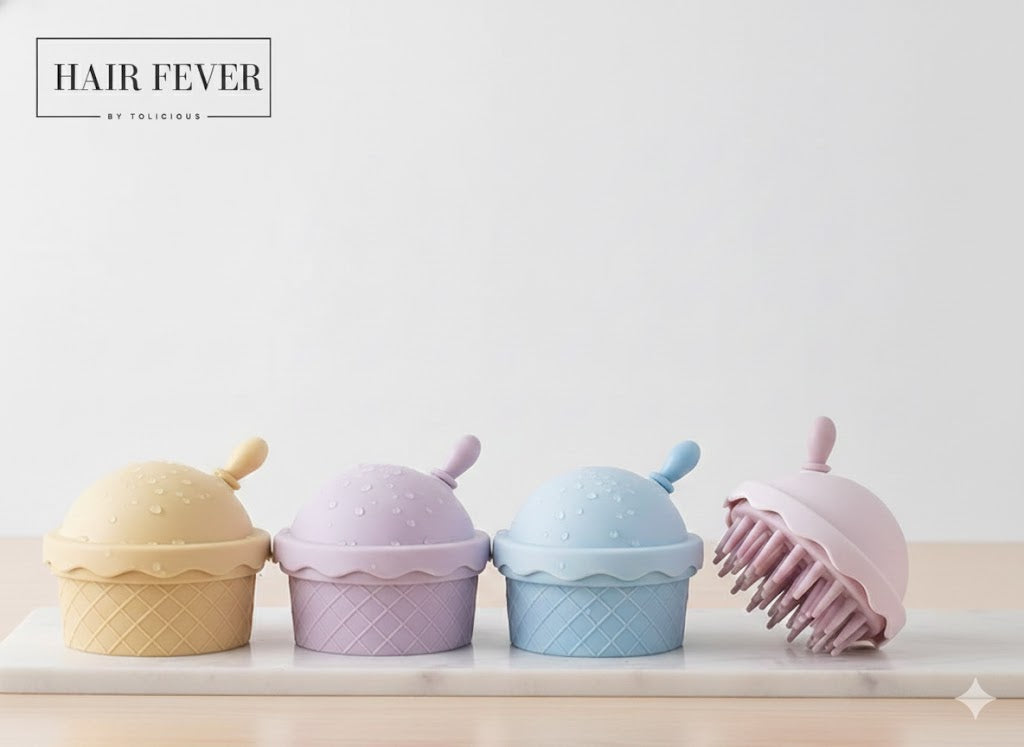 The Hair Fever Scalp Massager Brush by Tolicious is a fun, ice-cream–inspired scalp brush designed to gently cleanse, massage, and stimulate the scalp for healthier-looking hair.